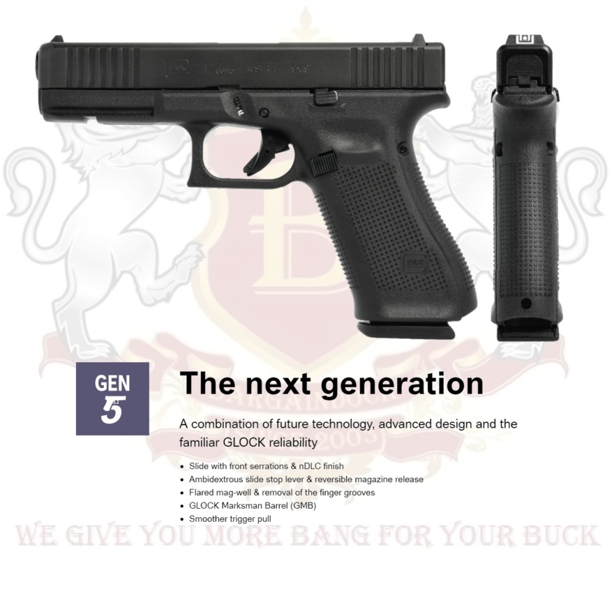 This model introduces a combination of future technology, advanced design and the familiar Glock reliability.  It features the latest Glock nDLC surface finish on the major metal components – unmatched in hardness and rust resistance, a high traction Gen5 frame texture, a quickly reversible magazine catch, an ambidextrous slide stop lever, the Glock Modular Backstrap System (MBS) for individual operator adjustability and the universally acclaimed Glock Safe Action® System.