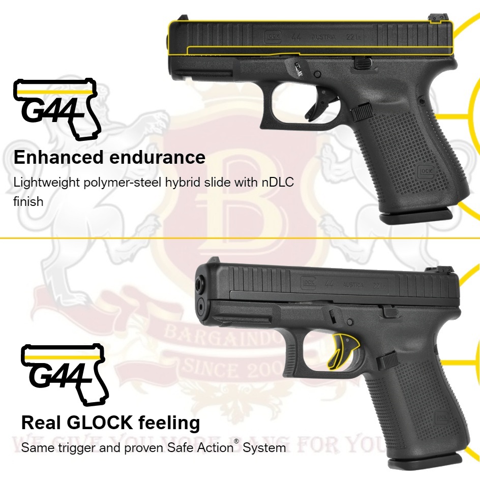 - Hybrid Steel-Polymer Slide – Specifically developed for the G44 the hybrid slide features high stability and durability. Strong and ultralight slide for better robustness and performance