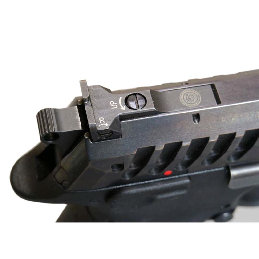 The K100 design and action have some serious benefits not found on many other higher priced guns. Instead of a tilt-barrel (a modified Browning design), it uses a rotating barrel that disengages a lug on the barrel from a channel in the slide while the bore axis remains in the same orientation to the slide and frame which positions the barrel slightly lower in the frame, putting it closer to the shooter’s hand. This in turn reduces the recoil’s leverage on the shooter’s wrist and makes it easier to control muzzle flip. As a result, the sights get back on target faster, shooting the gun is easier and accuracy is significantly increased compared to many other guns of similar size and caliber.