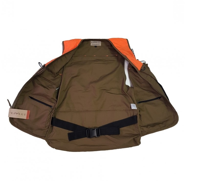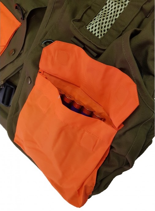 This Shooting Vest is crafted from durable tear resistant Rhino fabric with ballistic-grade nylon thread that features supple water repellent fibers to help you stay clean and dry by resisting the absorption of liquids into the yarns and blaze-orange accents to keep you visible. The robust lightweight material of this vest can handle bushwhacking through the bush and thickets as you flush game and the oversized front pockets with silent magnetic flaps as well as the front-loading lined game pouch offer ample storage space and ease of access.